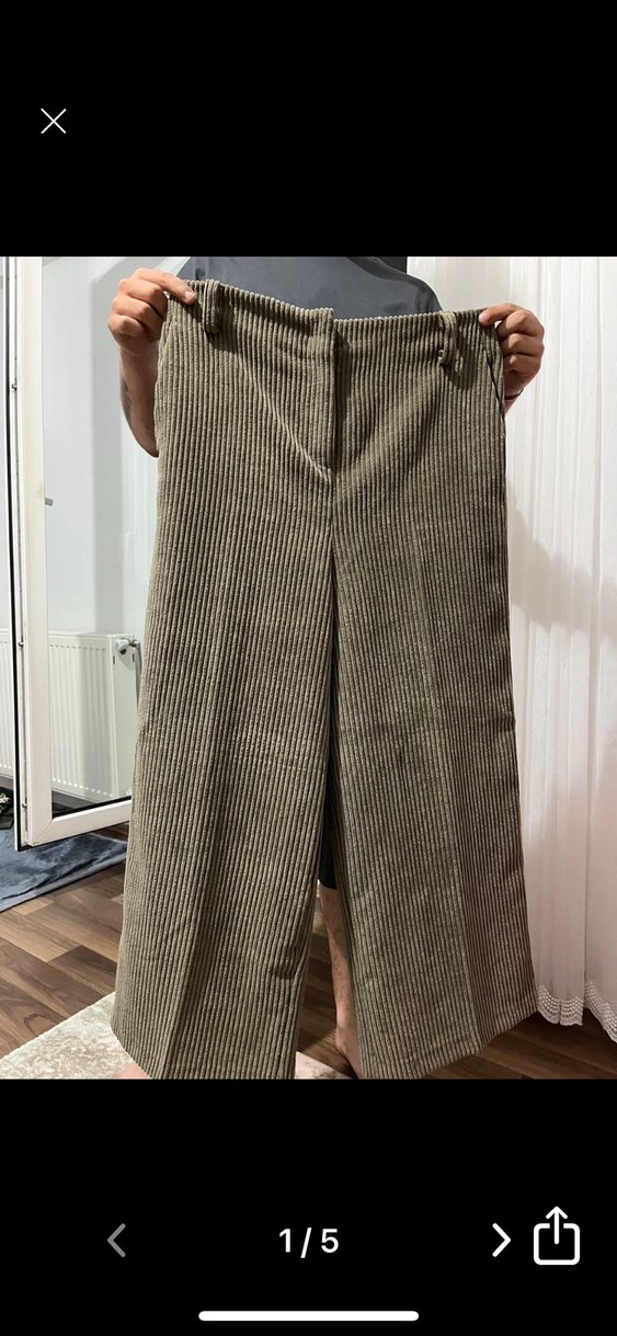 Kadınlar için normal boyda rahat kesimli fitilli kadife pantolon. Haki rengiyle ofis için uygun, trend bir görünüm sunar.