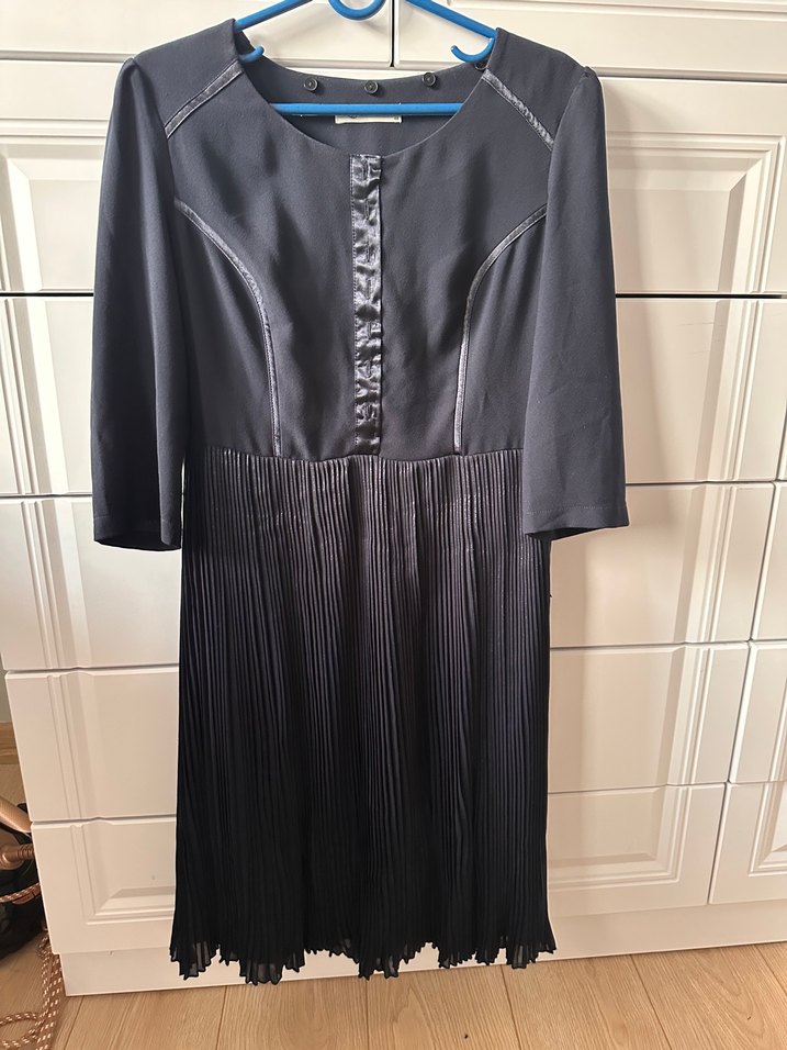 Kadınlar için pilili etekli, üç çeyrek kollu, saten detaylı lacivert ofis elbisesi. Öndeki düğmeleri çıkartılıp dikildi