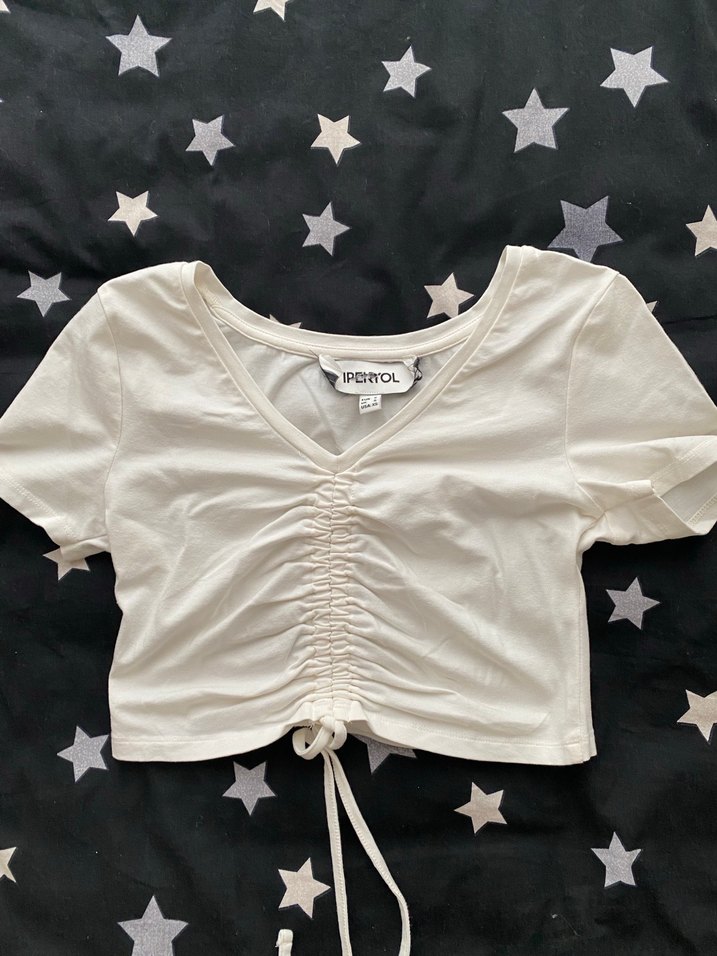 Pamuk kumaştan yapılmış, kısa kollu ve V yakalı, ön kısmında pilili detaylara sahip beyaz renkli kadın tişörtü. Pastel tonlarda baskılı desen içerir.