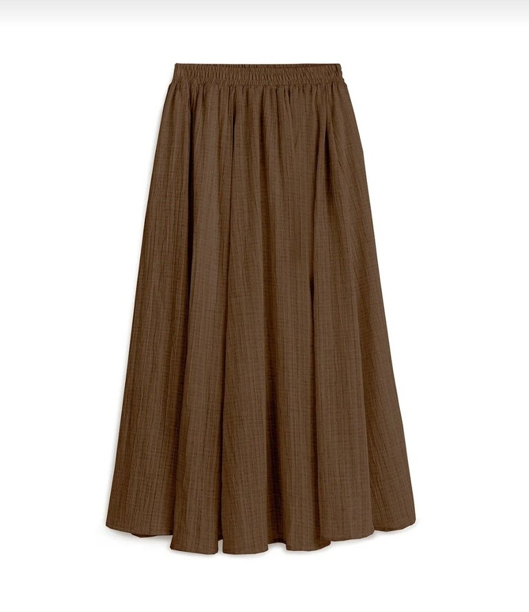 Kadınlar için piliseki bol ve rahat kesim, yumuşak keten kumaştan yapılmış koyu kahverengi astarlı uzun etek. 50-56 bedenlere uyumludur.