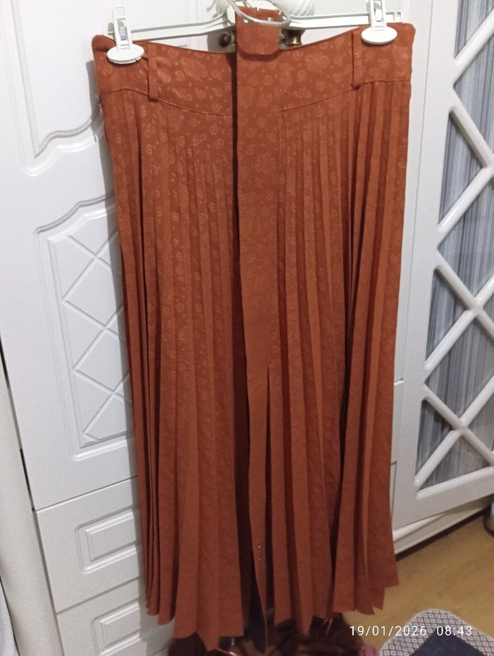 uzun etek, pilili ve bol kesimdir. Yumuşak sentetik kumaştan yapılmıştır. Vintage tarzıyla bohem ve retro görünüme uygundur.