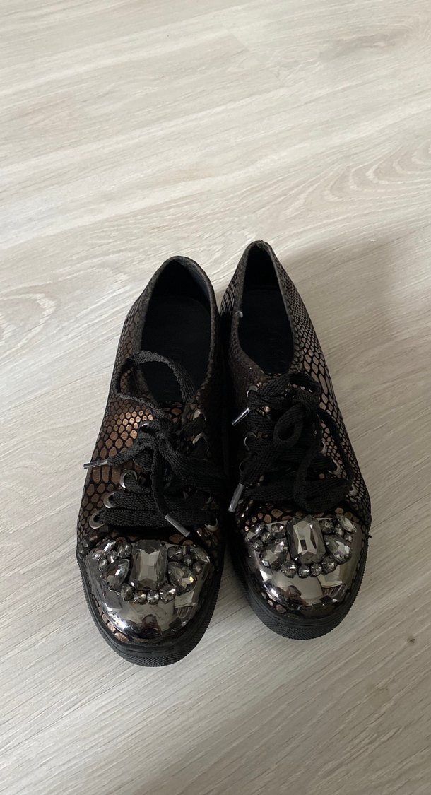Kahverengi yılan desenli kadın platform sneakers, taşlı detaylara sahip, kauçuk tabanlı. Günlük kullanım için şık tarzda.