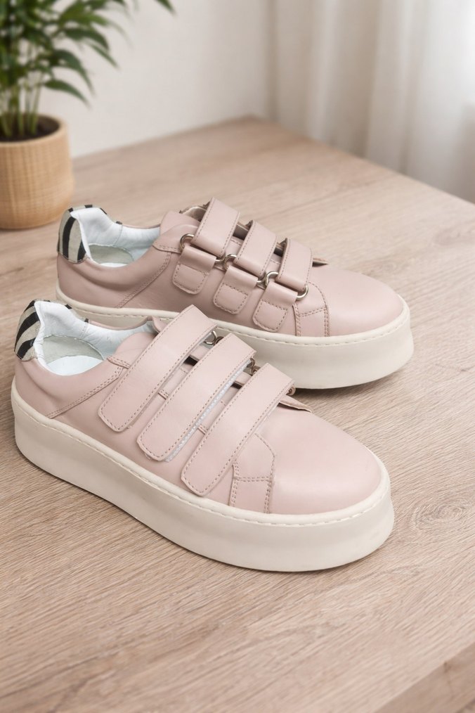 Üç tokalı kayışlı, platform tabanlı kadın spor ayakkabısı. Sokak stili ve günlük kullanım için uygun, pastel tonlarda ve desensiz. iki rengi mevcut istediğiniz renge ilan açılır