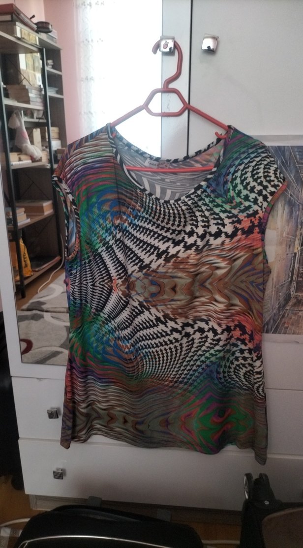 Kadınlar için kolsuz, kayık yaka ve bol kesim kısa mini bluz. Sentetik kumaştan üretilmiş, koyu ve canlı kravat boya desenli, pliseli detaylara sahip.