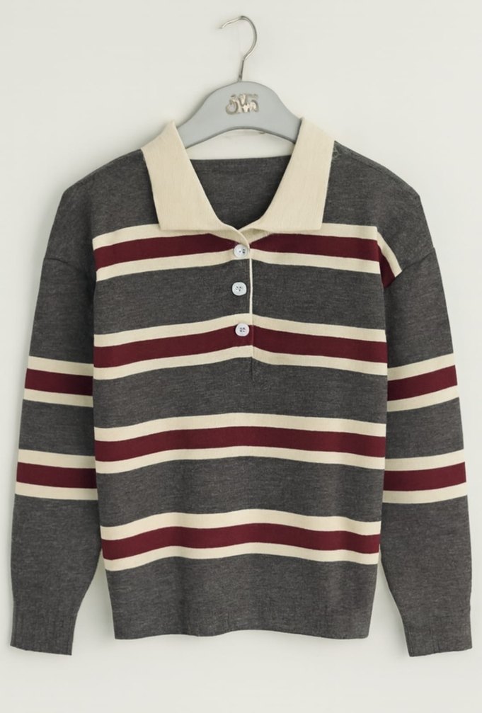 KADIN POLO YAKA ÇİZGİLİ TRiKO KAzAK - Görsel 1