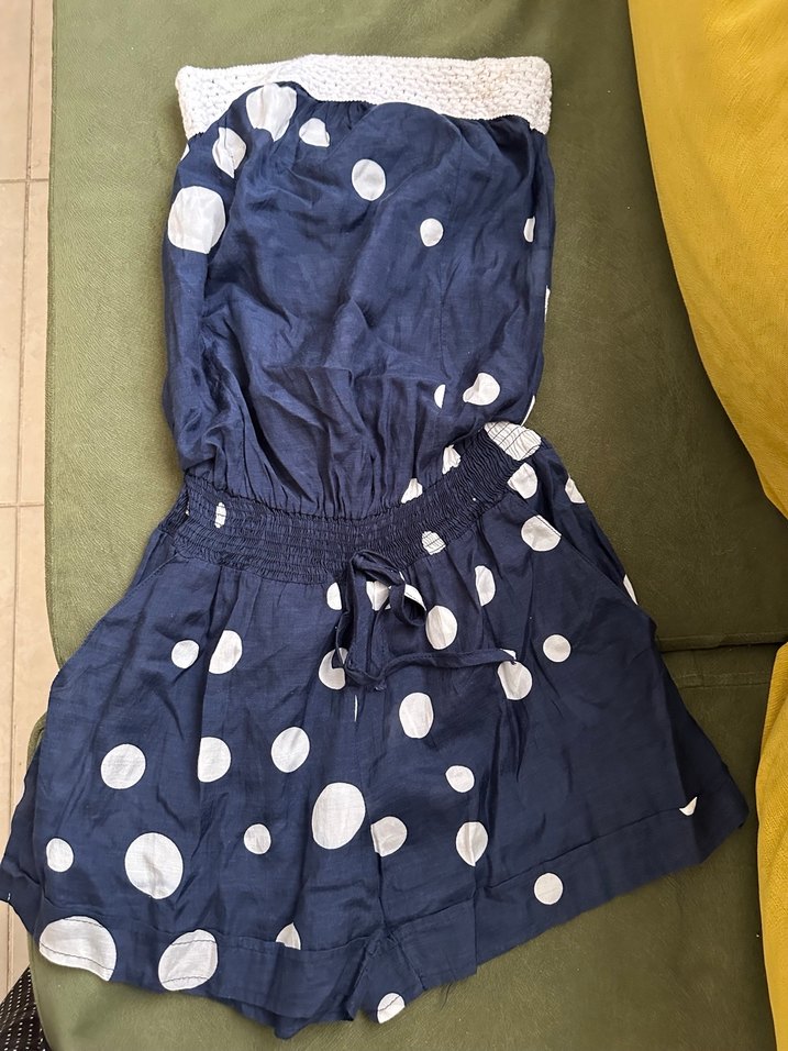 Kadınlar için mavi puantiyeli, straplez kısa tulum. Sentetik kumaştan, bol kesim ve rahat bir dış mekan tarzı sunar.