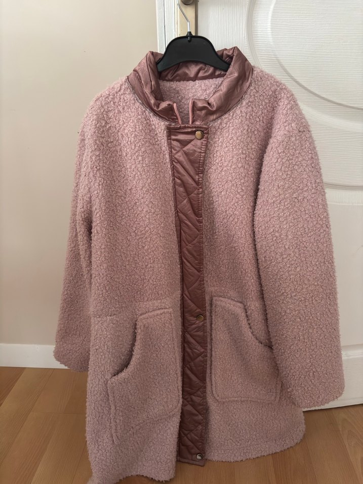 Görüldüğü gibidir Kadın peluş kumaştan yapılmış, bol kesim, uzun kollu, yaka detaylı, pastel pudra rengi midi kaban. Rahat ve günlük kullanıma uygun. .