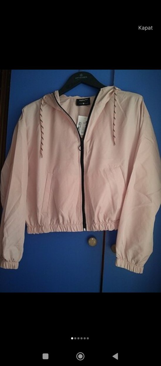 Pastel pembe renkte, uzun kollu ve mini boyda, fermuarlı kadın ceket. Rahat kesimi ve kapüşonuyla günlük kullanım için uygundur. etiketi çıkarıldı ama hiç giyilmedi