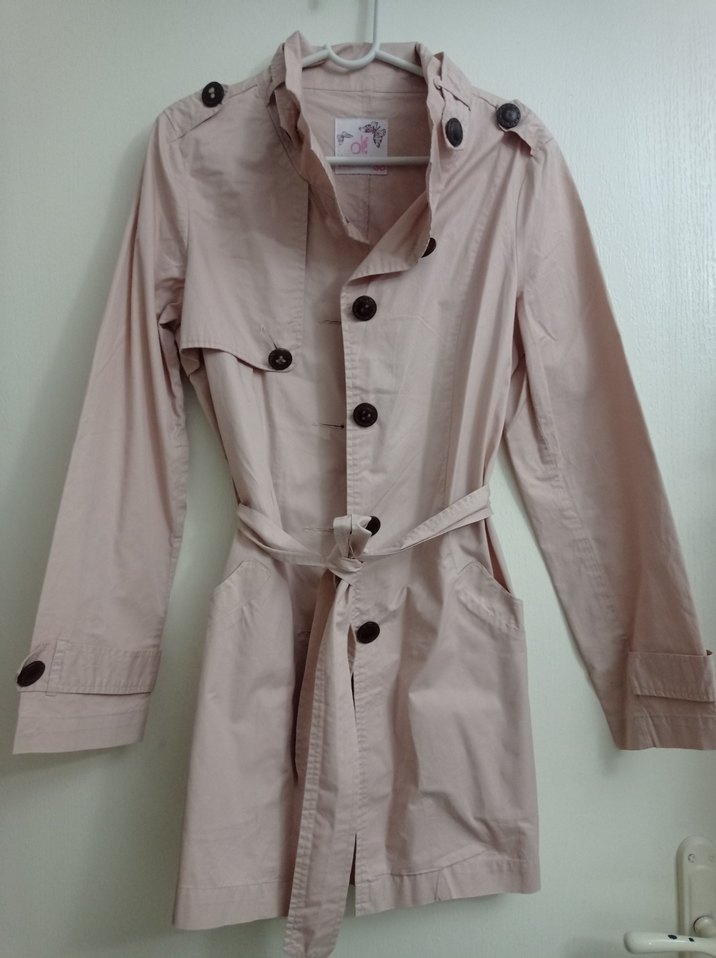 Pudra pembe midi boy kadın trençkot, düğmeli ön ve kemerli. İnce kumaştan yazın ve baharda giymelik. 34-36-38 giyenlere olur