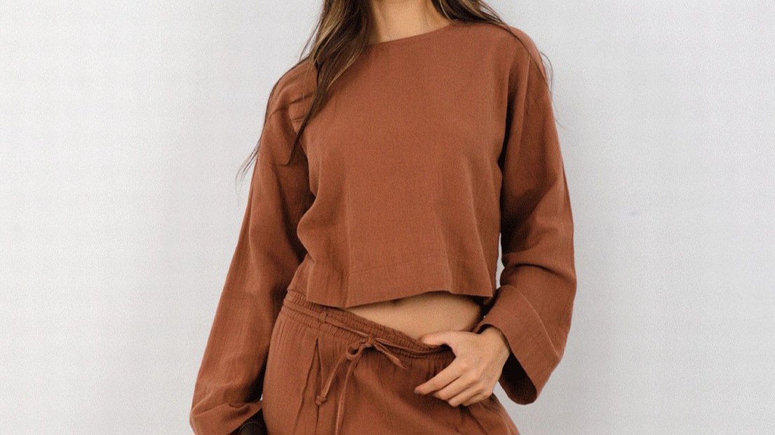 Kadınlar için bol kesim, uzun kollu ve yuvarlak yakalı pembe crop üst. Yumuşak keten kumaştan, sade ve desen içermeyen tasarım. Rahat ve şık günlük kullanım için uygundur.