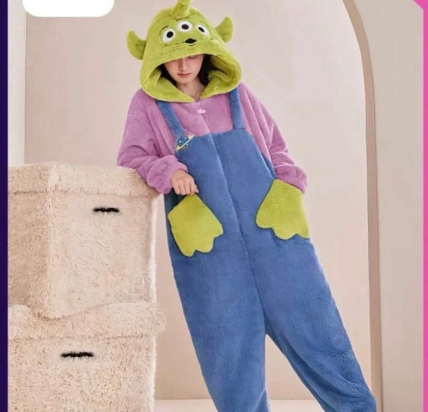 Rahat kesim, uzun kollu, askısız, pastel mor renkli tulum. Mavi ve yeşil detaylar, fermuarlı ön kısım ve yumuşak kumaş. Yeni standart beden 75 kiloya kadar uygundur