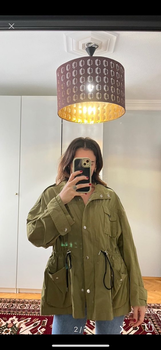 Bu haki pamuk ceket parlak görünümlü, uzun kollu ve yüksek yakalıdır. Rahat kesim ve midi boy ile dış mekanlarda şık bir rahatlık sunar.