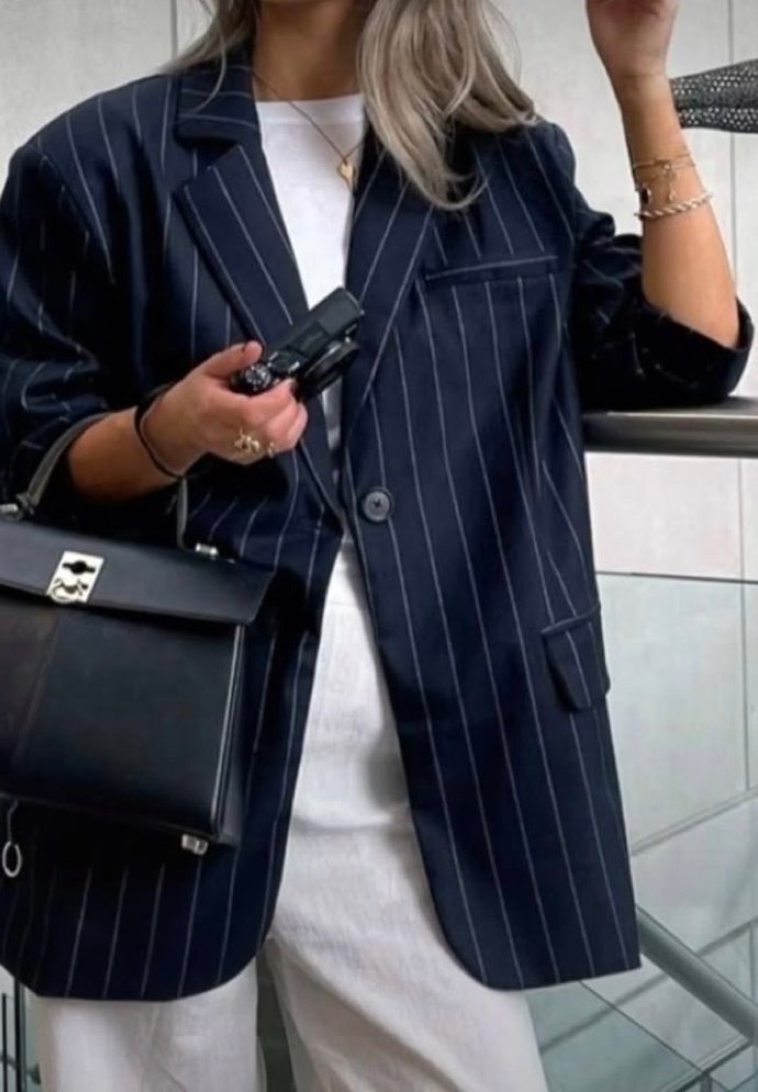 Kadınlar için regular fit, çizgili desenli, notched lapel yakalı midi uzunlukta blazer. Ofis ve günlük şıklık için uygun, tek düğmeli ve cepli.