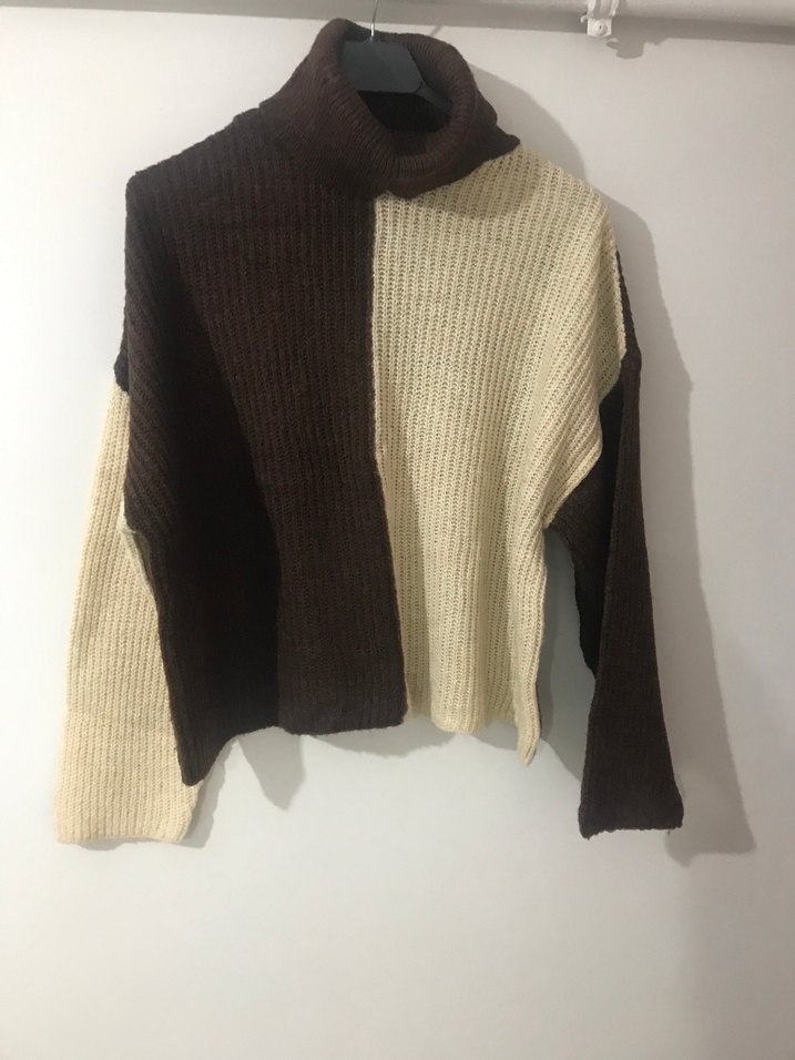 Kadınlar için boğazlı, uzun kollu ve renk bloklu triko kazak. Rahat kesimi ve kahverengi ile krem renkleriyle modern ve sıcak bir görünüm sunar.