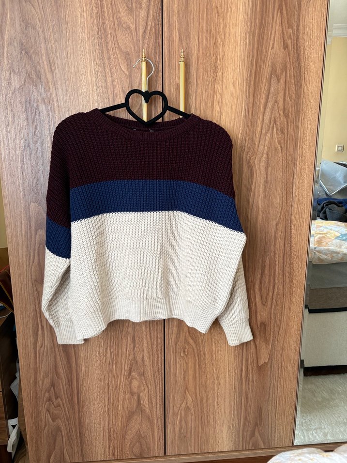 Kadınlar için örgü, bol kesim, uzun kollu ve bisiklet yakalı rahat kazak. Koyu kahverengi, lacivert ve krem renk bloklu tasarım.