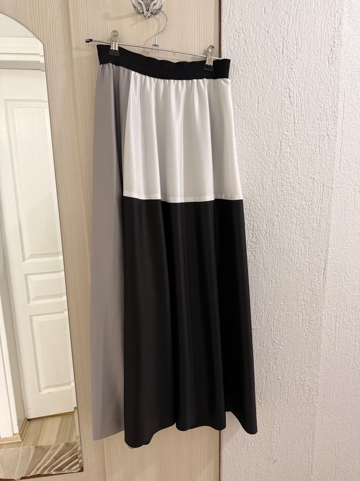 Kadınlar için gri, beyaz ve siyah renk bloklu, salaş kesim ve drapeli uzun etek. Yumuşak sentetik kumaştan, çağdaş ve Paris tarzını yansıtır. Bel kısmı lastiklidir ⚠️boy 160 kg 60