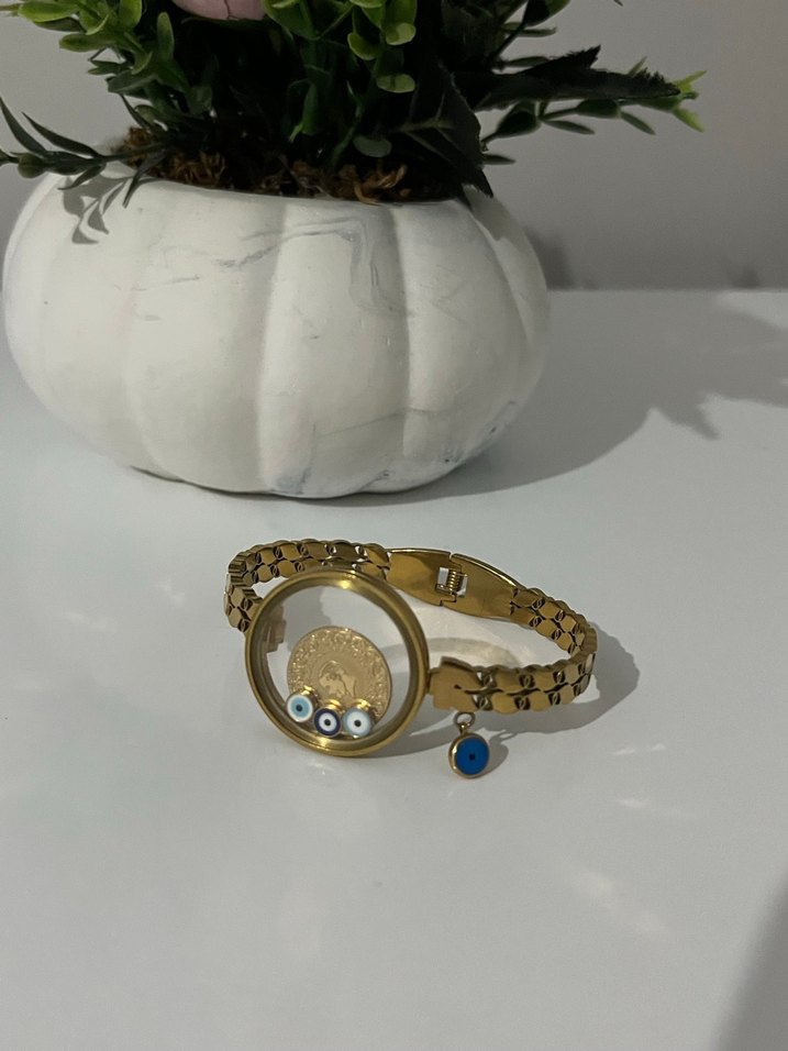 Altın renkli, zincir detaylı, yılan deseni ve mavi nazar boncuklu bohem tarzda günlük kullanıma uygun bileklik.