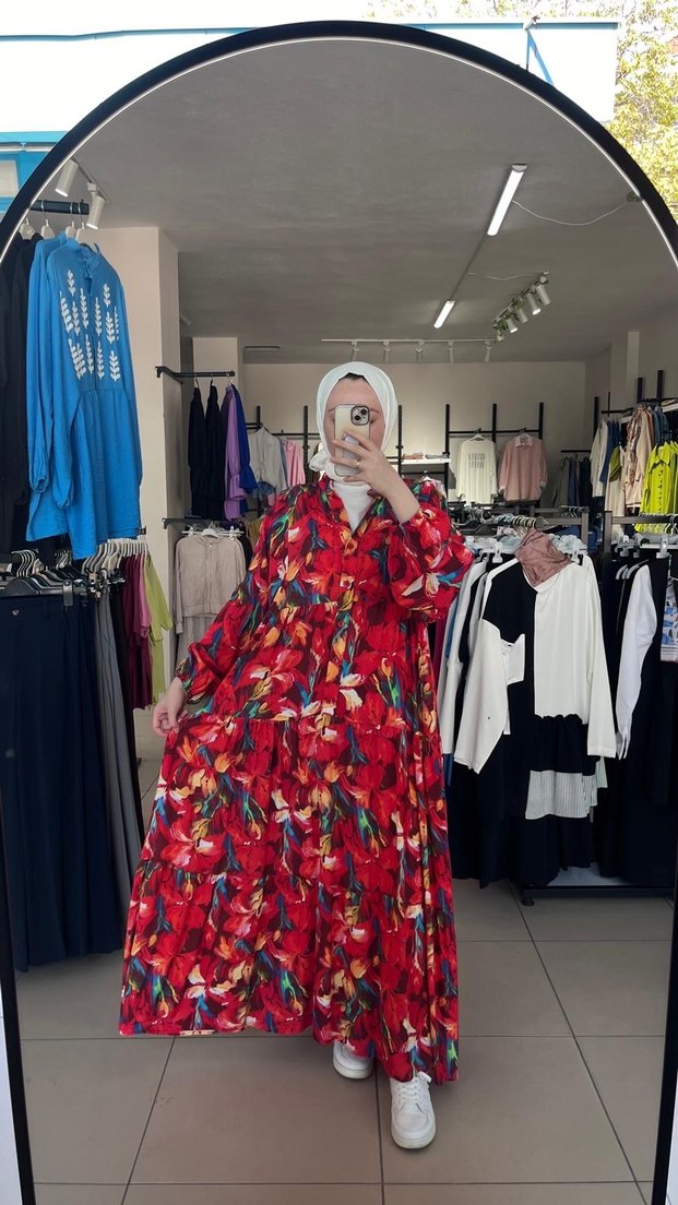 Kadınlar için bol kesim, drapeli uzun kollu elbise. Yumuşak sentetik kumaştan, yüksek yakalı, renkli kırmızı batik desenlidir, günlük kullanım için uygundur. 3 adet l-xl göğüs 106 cm kol 66 cm boy 135-137 cm
