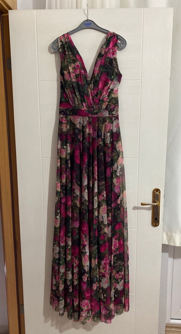 Kolsuz, V yakalı ve drapeli uzun elbise. Çok renkli çiçek deseniyle düğün için uygundur. 38 beden bir kere giyildi