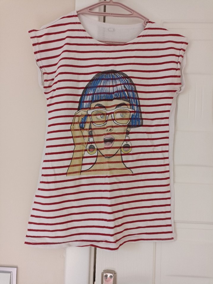 Kısa kollu, bisiklet yaka, bol kesim kadin tişörtü. Yumuşak örme kumaş üzerinde renkli baskı deseni bulunur. defosu yok az kullanıldı bedeni 40