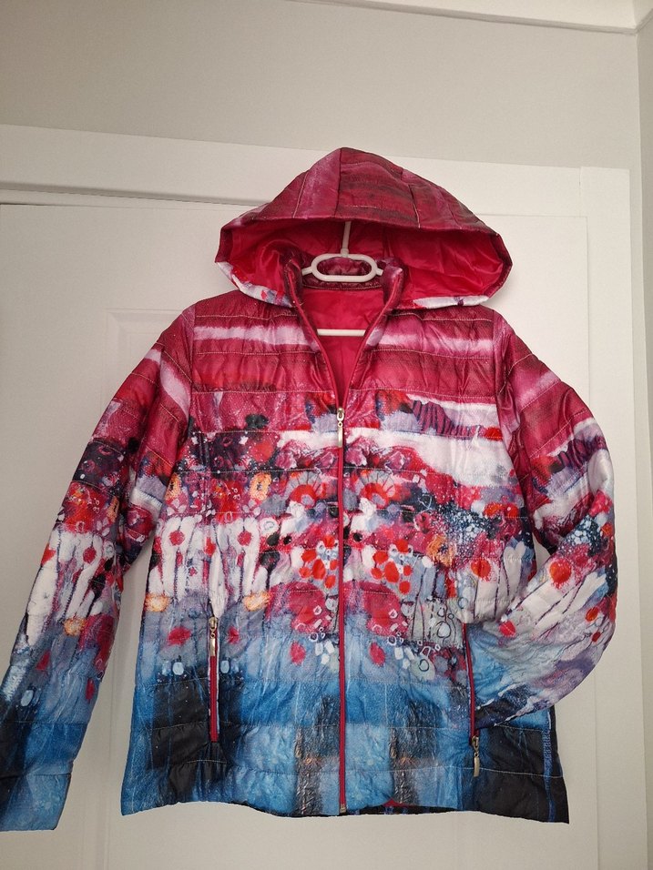 Renkli tie-dye desenli, kapüşonlu ve fermuarlı kadın ceket. Uzun kollu, kısa boyda, sokak stiline uygun.