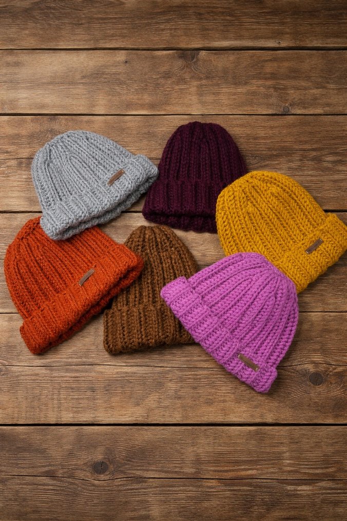 Kadınlar için örgüden yapılmış, kahverengi ve renkli tonlarda rahat ve sade bere. Günlük kullanıma uygun, sıcak tutar.