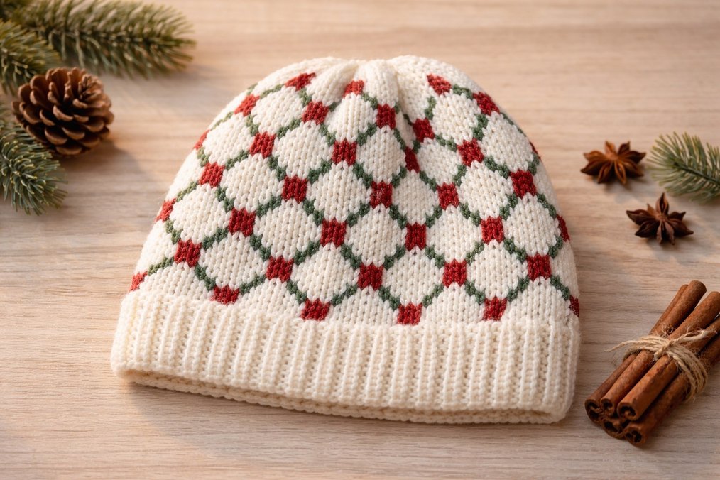 Kadınlar için beyaz zeminli, kırmızı ve yeşil renkli örgü desenli, yumuşak ve sıcak dokulu konforlu bere. Geleneksel tarzda, rahat bir kullanıma sahiptir. kaliteli malzeme , el emeği