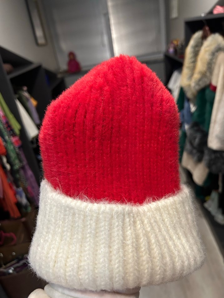 Kadınlar için kırmızı ve beyaz renkli, örgü ve rahat dokulu bere. Sokak stili için uygun, renkli ve sıcak tutar.