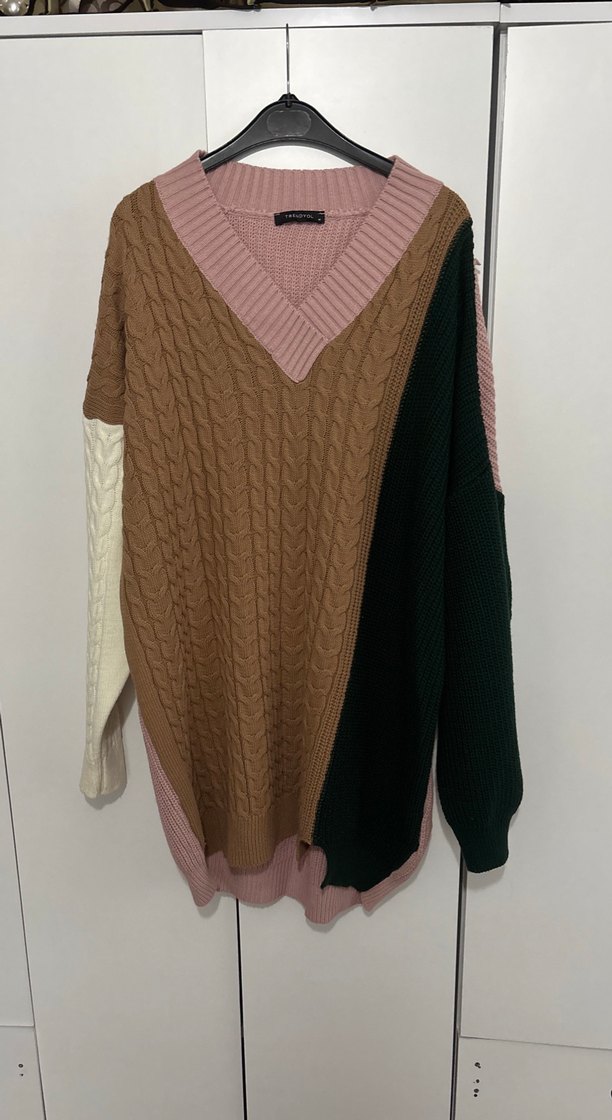 Kadınlar için örgü triko kazak, bol kesim ve uzun kolludur. Kahverengi, siyah, beyaz ve pembe renk bloklu tasarımıyla rahat ve gündelik kullanıma uygundur.