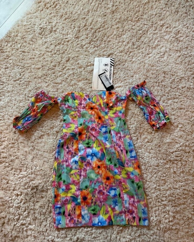 Renkli tie-dye desenli, straplez, kısa kollu ve fırfırlı kız çocuk elbisesi, sentetik kumaştan üretilmiştir.