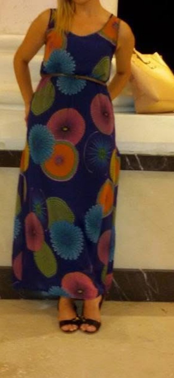M beden. Renkli desenli şifon elbise. Belinin kemeri de mevcut. fotoğraflarda görünmüyor fakat eklenecektir Kadınlar için renkli, uzun, kolsuz ve oturan kesim elbise. Sentetik kumaştan, bağlama desenli, drapeli ve straplez yakalı bohem tarzda.