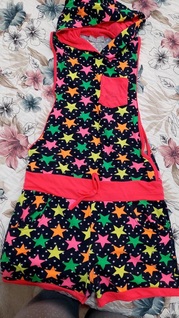 Kız çocuklar da için uygundur, renkli yıldız desenli, fermuarlı, kolsuz ve beli pembe detaylı tulum.