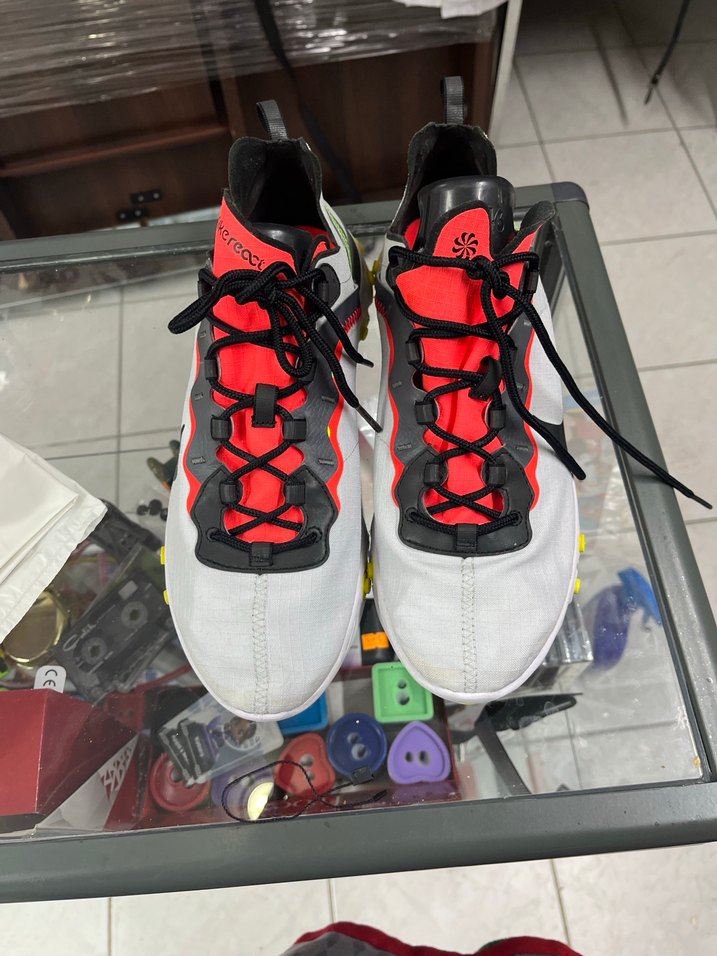 Unisex renkli, yüksek topuklu spor ayakkabı, elastik yapısı ve desenli kırmızı-beyaz detaylarıyla sokak modasına uygun.