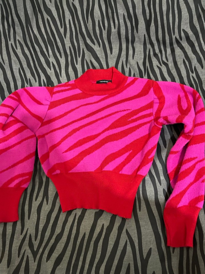 Pembe ve kırmızı renklerde zebra desenli, uzun kollu, yüksek yakalı, fitted kesim kadın triko kazak. Yumuşak sentetik kumaştan, rahat ve sokak modasına uygun.