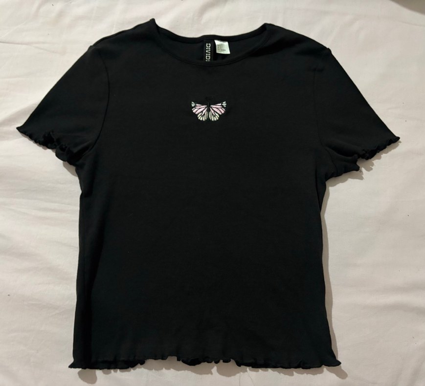 Kızlar için oturan kesim, kısa kollu siyah crop Önünde küçük kelebek baskısı bulunur. Pürüzsüz sentetik kumaştan yapılmıştır H&M marka S beden hasarsız ve temiz kullanılmıştır