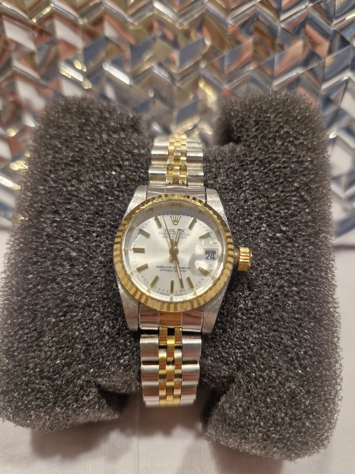 Rolex model görünümlü, 25 mm orijinal olmayan bayan kol saati satılıktır. Hiç kullanılmamıştır, çalışır durumdadır. Altın–gümüş renkli metal kordonludur ve tarih göstergesi bulunmaktadır. Mekanizma tipi bilinmemektedir. Günlük kullanım veya aksesuar amaçlı tercih edilebilir. Kordon ayarı yapılmadı. Kozmetik durumu fotoğraflarda görüldüğü gibidir.