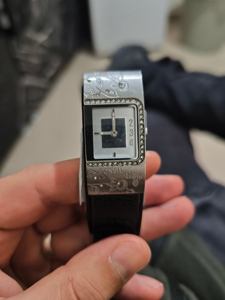 Gri tokalı kayışa ve çiçek desenli işlemelere sahip vintage tarzda kadın kol saati. Siyah kayış ve kristal detaylar içerir. ⌚