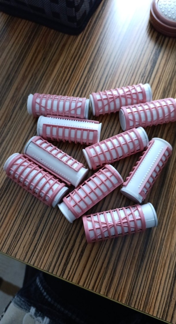 Kadın saçları için kullanılan, pembe ve beyaz renklerde, tutması kolay ızgara tasarımlı saç bigudisi seti. ♀️