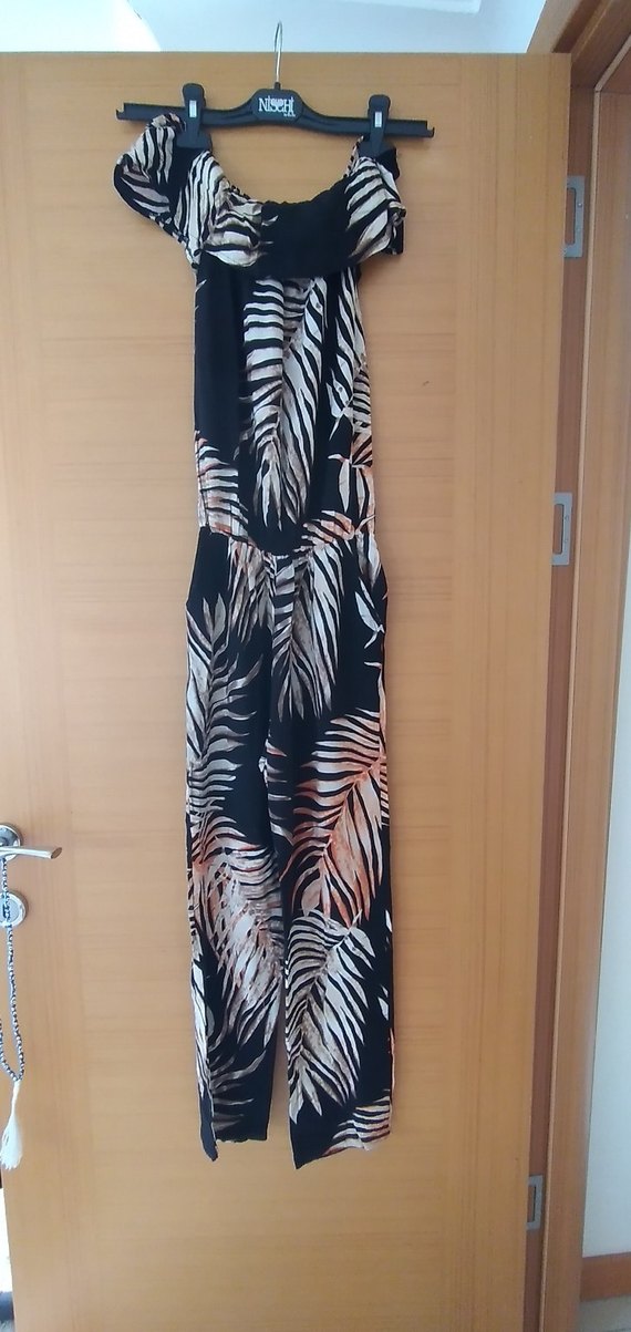 Kadınlar için straplez yada yakasızda , bol kesim ve drapeli tasarıma sahip önden cep detaylı yazlık kumaştan yapılmış çok renkli uzun tulum. Sokak stili için uygun.