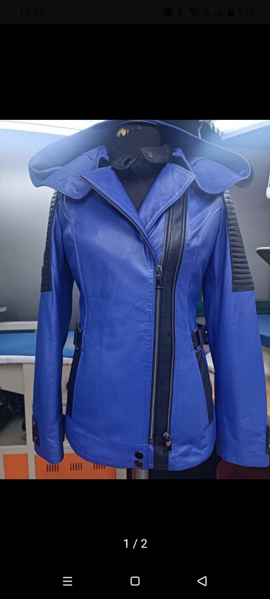 Kadın saks mavi hakiki deri ceket, yakalı, kemerli, uzun kollu ve regular fit. muhteşem her yerde olmayan bir renk hem kaliteli hem havalı. tarzıyla fark yaratmak isteyenlere