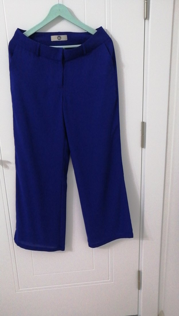 Bol paça Saks mavisi, kumaş pantolon. İnce bir kumaşı ve astarı var.. İki yandan cepli Minimalist ve normcore tarzıyla, ofis ve gündelik şıklık için uygun, yumuşak krep kumaştan yapılmıştır. ✨