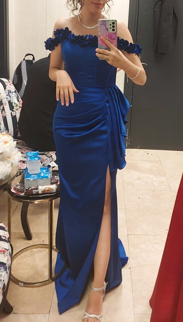 Drapeli ve uzun, saks mavi saten kumaştan, straplez ve korseli vücuda oturan abiye elbisedir. omuzları çiçek detaylı 2 kere giyildi Düğün nişan mezuniyet için uygundur.