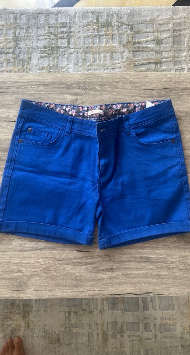 Yazın vazgeçilmezi mini şort. Rahat kalıp, şık görünüm. 40 beden, saks mavi renk. Hiç kullanılmadı, tertemiz durumda. Kumaşı pamuklu esnek yapıdadır.