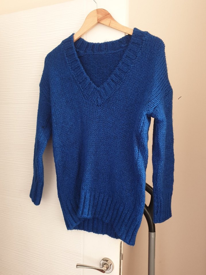 Kadınlar için örgü dokulu, V yakalı ve uzun kollu mavi kazak. Rahat kesimiyle günlük kullanıma uygundur.