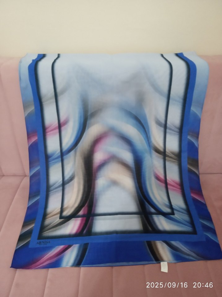 Mavi renkli, drape tasarımlı kadın şal, pastel tonlarda ve çağdaş stil ile avant-garde modaya uygun.