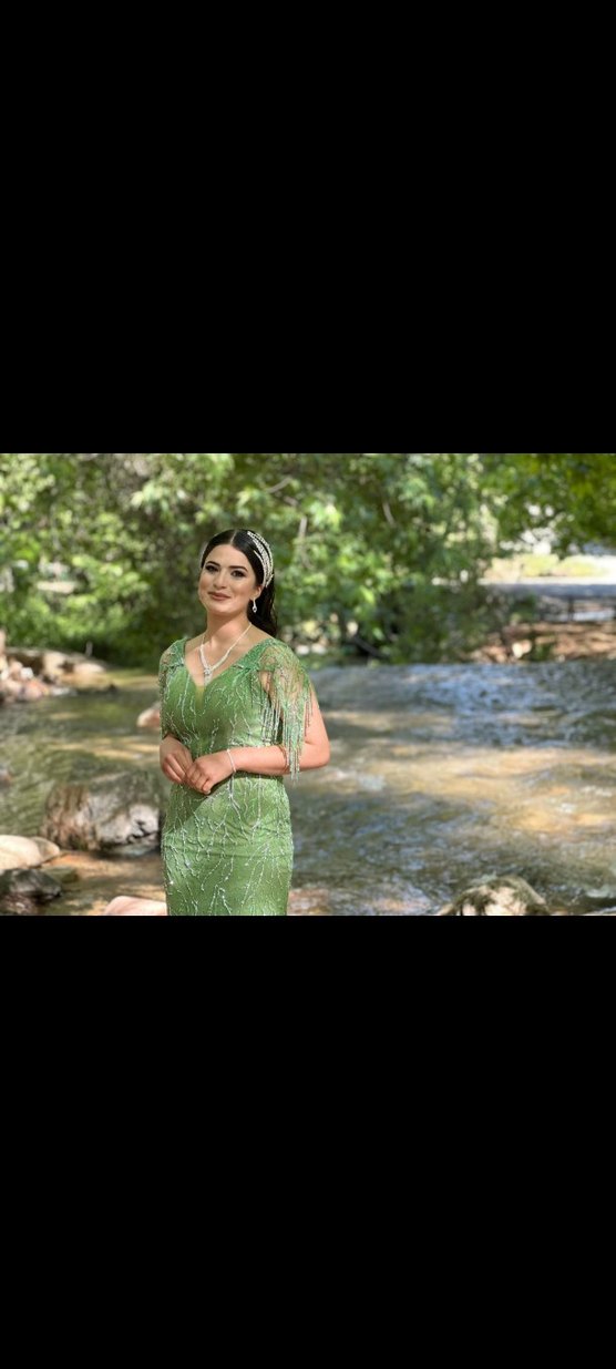 Uzun, haki renkli, V yaka ve kısa kollu elbise. Parlak yılan desenli, şal detaylı ve rahat kesimlidir. Düğün gibi özel günler için uygundur.