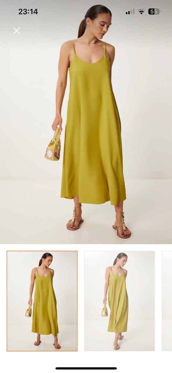 Kadın salaş kesim, askısız yaka ve ipeksi kumaştan yapılmış uzun, haki elbise, günlük kullanım için zahmetsiz şıklık sunar.