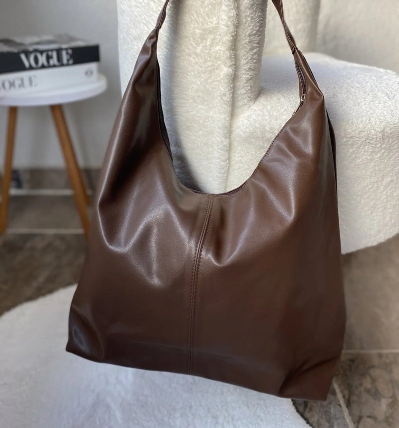 Parlak Acı Kahve rengi suni deri kadın çanta, minimalist tasarım ve fermuarlı kapanışa sahip, günlük kullanım için modern ve klasik şıklık sunar.