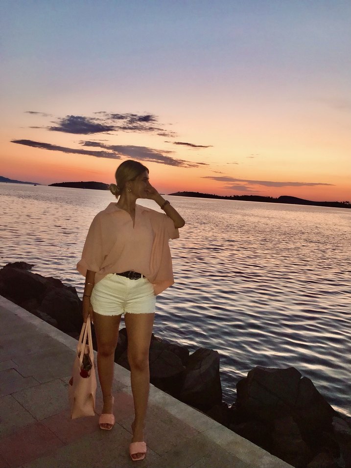 Satenimsi kumaştan, pembe detaylı, bol kesim bluz. Günlük rahat kullanım için uygundur.
