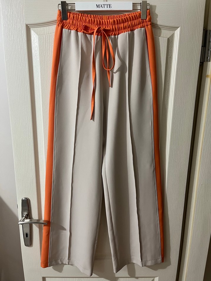Kadınlar için kemerli, salaş kesim kumaş pantolon. Bej ana renk ve canlı turuncu yan detayları bulunur. Pürüzsüz sentetik kumaştan, günlük kullanım ve sokak stiline uygun.